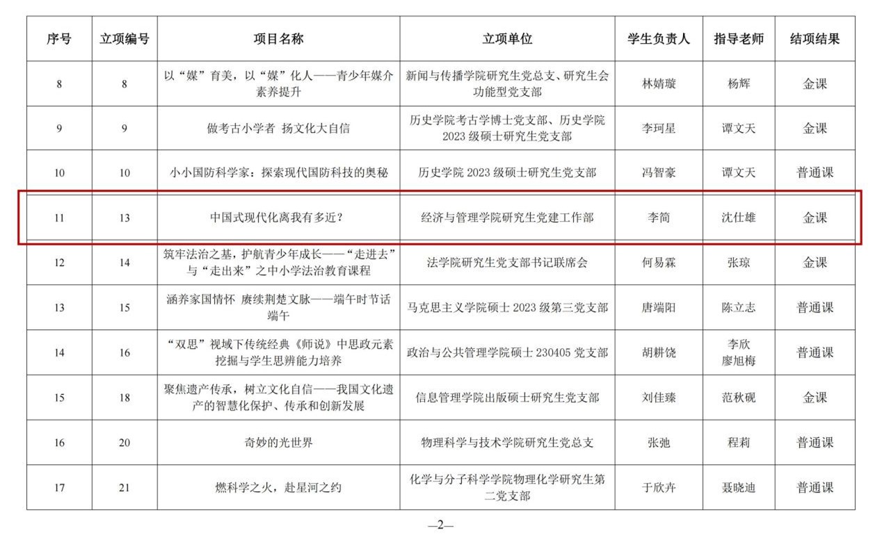 研究生党支部申报的项目“中国式现代化离我有多近?”凭借精心选题与扎实开展,获评“金课”。
