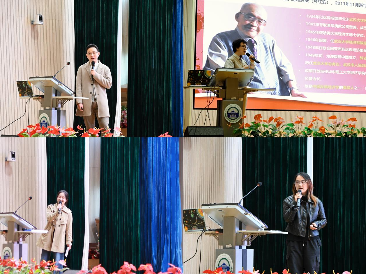 的三名研究生党支部书记以接力式讲授方式,为同学们带来一堂既贴近生活又关联国家发展的经济学启蒙课。高翔宇同志以“武汉长江大桥”为引入,引导学生从熟悉的城市地标理解国家“五年规划”制度。罗光锐同志用“早餐摊博弈”的短片引发讨论,在轻松氛围中讲解合作共赢、纳什均衡等基本经济学思想。他通过讲述张培刚教授的事迹,引导学生把学习与责任、个人理想与国家愿景结合起来。王锐霞同志以“五年规划中的风险意识”为起点,将国家的理性布局延伸到“人生规划”。