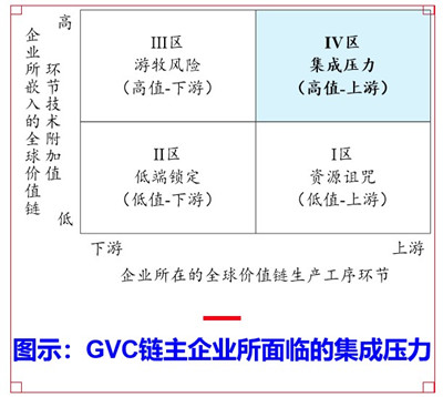 如图所示,横轴是全球价值链的生产工序——上游或下游,纵轴是所嵌入环节的技术附加值——高值或低值。一区的低值-上游环节,存在着“资源诅咒”;二区的低值-下游环节,是中国企业在全球价值链嵌入中特别需要避免的由简单加工制造形成的“低端锁定”困境;三区的高值-下游环节,虽然技术附加值较高,但仍处于被动接受链主企业发包的下游,作为承包方而存在游牧风险;四区的高值-上游环节在全球价值链中地位和处境最为优越,但需要有非常好的技术前瞻能力,以及对整个全球价值链条进行把握、整合、掌控的卓越集成能力,即链主企业将面对极强的集成压力。我想,研究路径三可以探讨如何通过数字化、智能化、低碳化等技术创新机遇而进行弯道超车,实现从低值-下游环节到高值-上游环节的跃升,企业以此锻造出自己的集成能力,从而实现从全球价值链参与者到领导者的高端跃升。