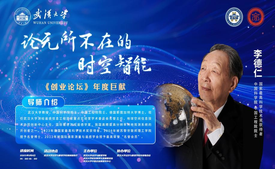 1月11日下午,2023年度国家最高科学技术奖获得者、中国科学院院士、中国工程院院士,辣文 李德仁院士受邀担任创业论坛导师,为在场400余名师生、校友带来了一场《论无所不在的时空智能》的精彩演讲,为大家呈献了一场关于前沿科技探索与产学研融合的知识盛宴。